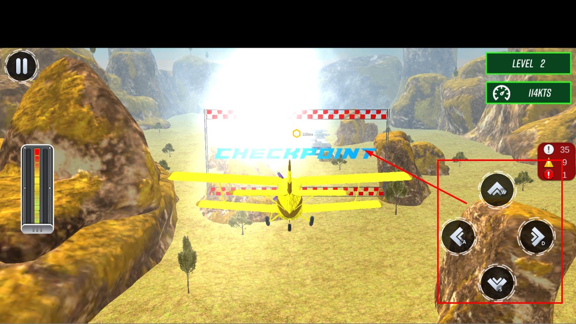 2、通过方向按钮操控飞机,调整姿态与速度,以【114KTS】穿过【CHECKPOINT】,保证飞行稳定。