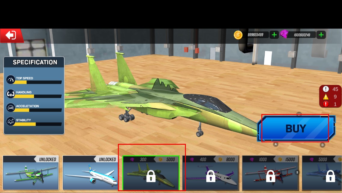 4、攒够【300】紫币和【5000】金币后,解锁该绿色战机,点击【BUY】购买,增强飞行性能助力航天任务。
