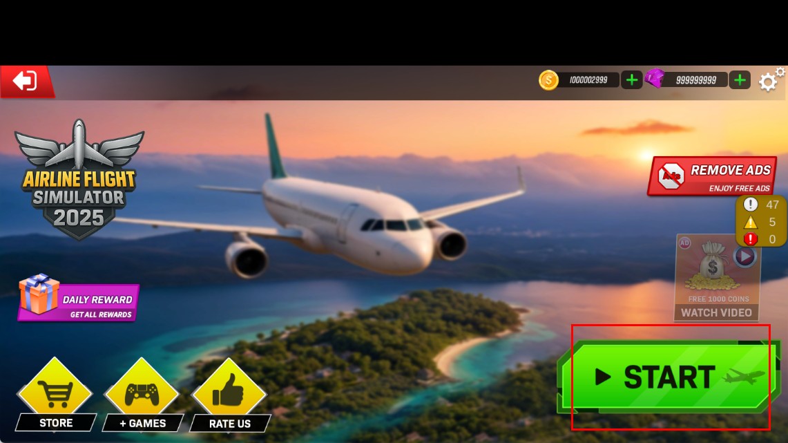 1、点击主界面绿色【START】按钮,即可进入游戏,开启航空飞行模拟之旅。