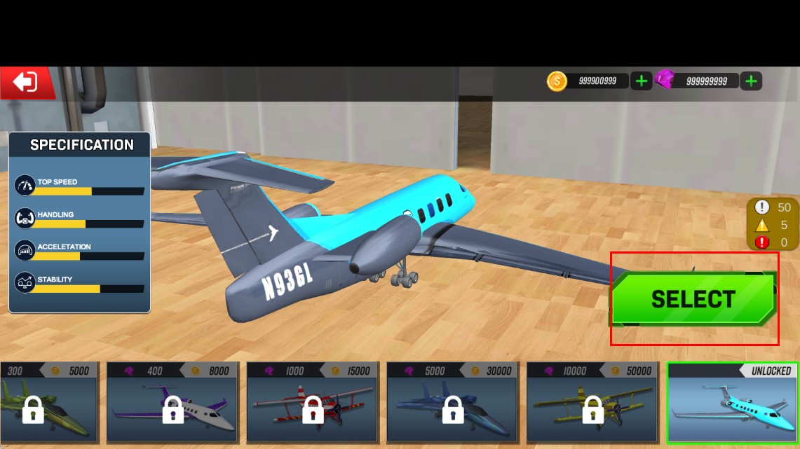 2、选中已解锁的【N936L】飞机,点击绿色【SELECT】,确认后进入飞行准备。