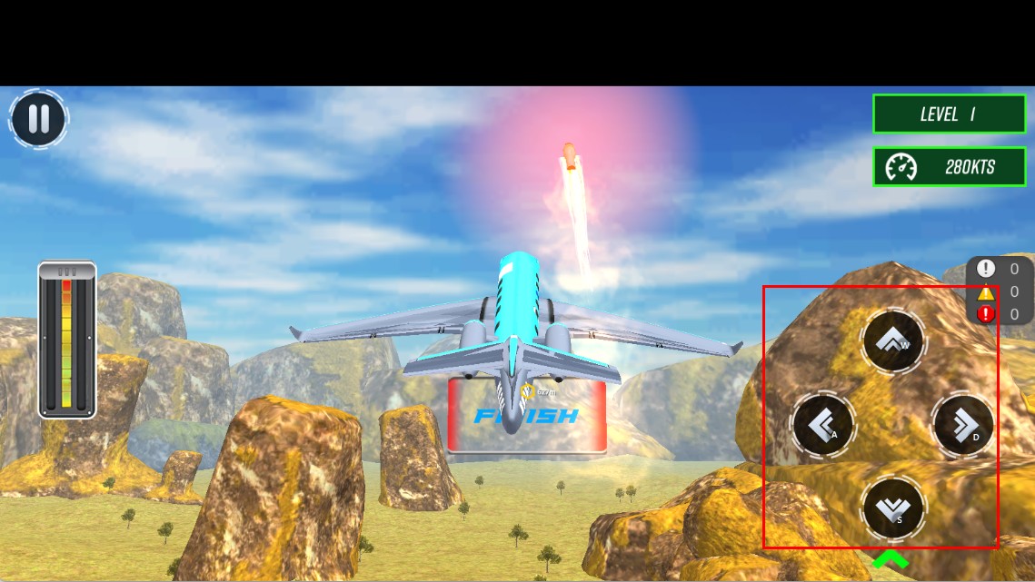 4、用右侧方向键控制方向,避障碍,朝【FINISH】区域完成飞行。