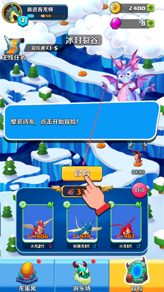 1、在冰封裂谷等场景中,点击冒险按钮开始冒险,选择出战的龙阵容如火龙、影翼龙等。