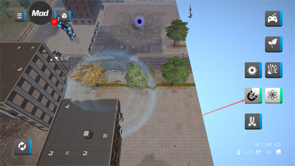 1、选择右侧的特殊工具如磁铁、激光等,对城市建筑、植被区域释放,制造破坏效果。