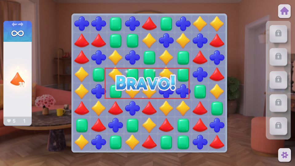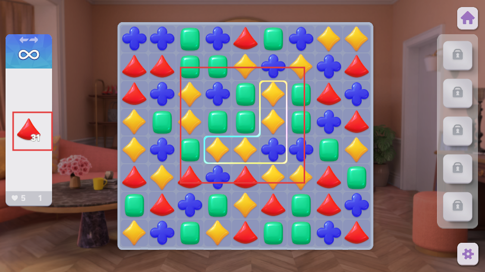 2、通过匹配相同形状和颜色的元素进行消除,完成关卡目标。