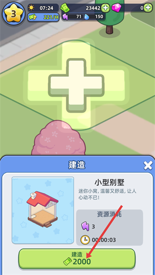 2、在建造界面,点击【建造2000】按钮可消耗资源建造小型别墅,提升小镇建筑规模。