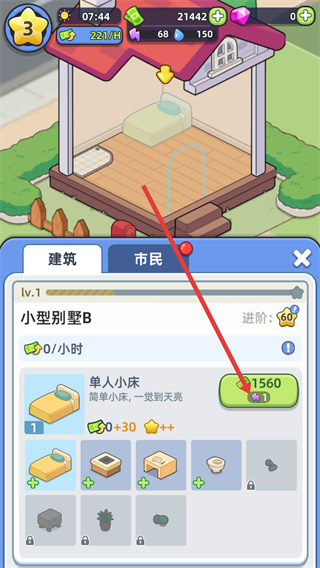 4、在建筑详情界面,点击【单人小床】对应的建造按钮,可消耗资源为建筑添加家具,提升建筑等级和收益。