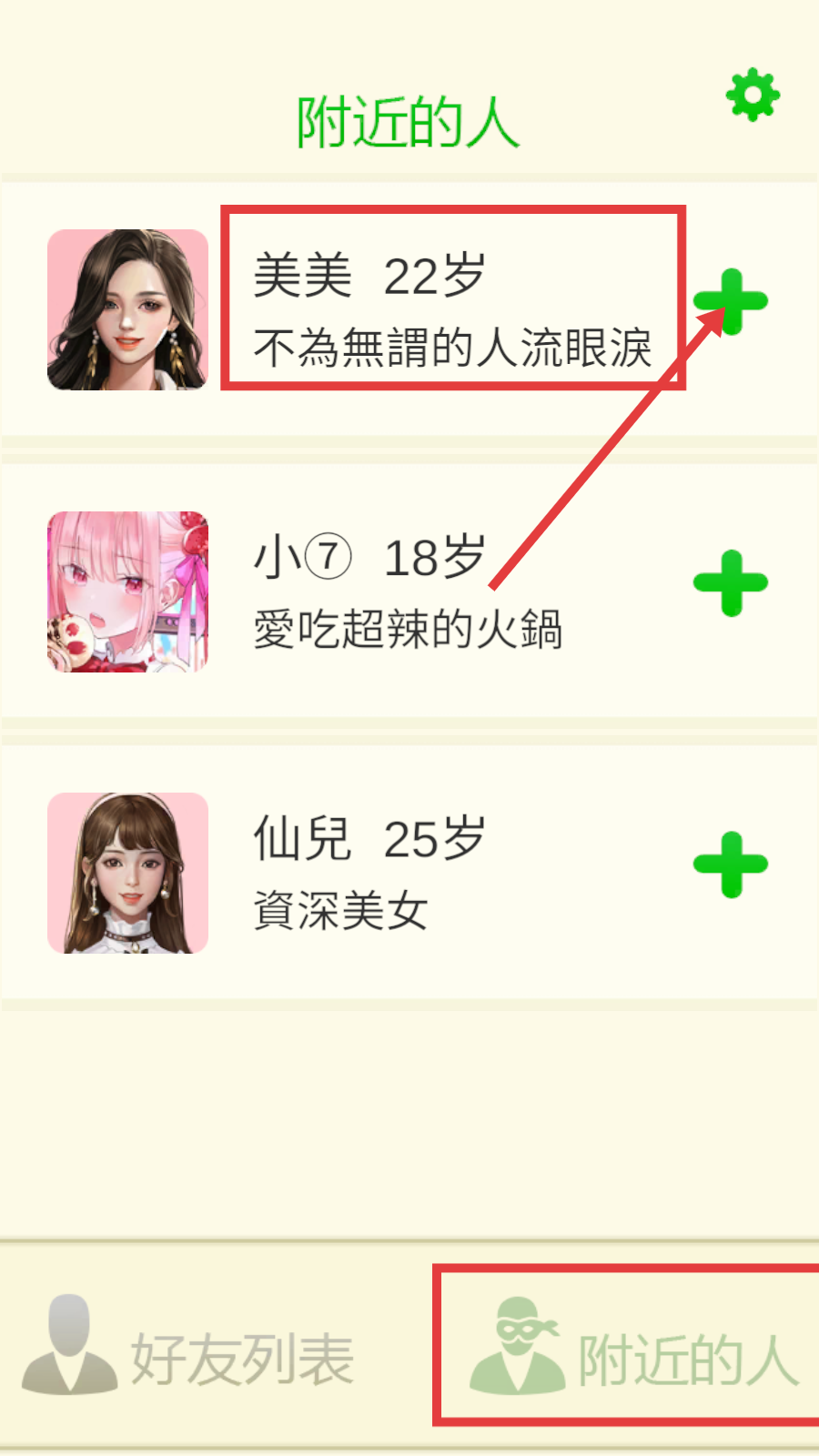 3、在【附近的人】列表中找到【美美-22岁-不為無謂的人流眼淚】,点击加号添加,拓展社交并开启专属聊天线。