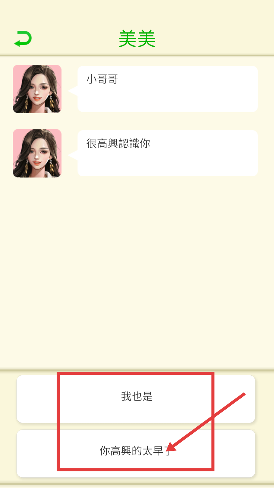 4、美美表示很高興認識你时,选择【你高興的太早了】,制造互动张力,推进聊天剧情发展。