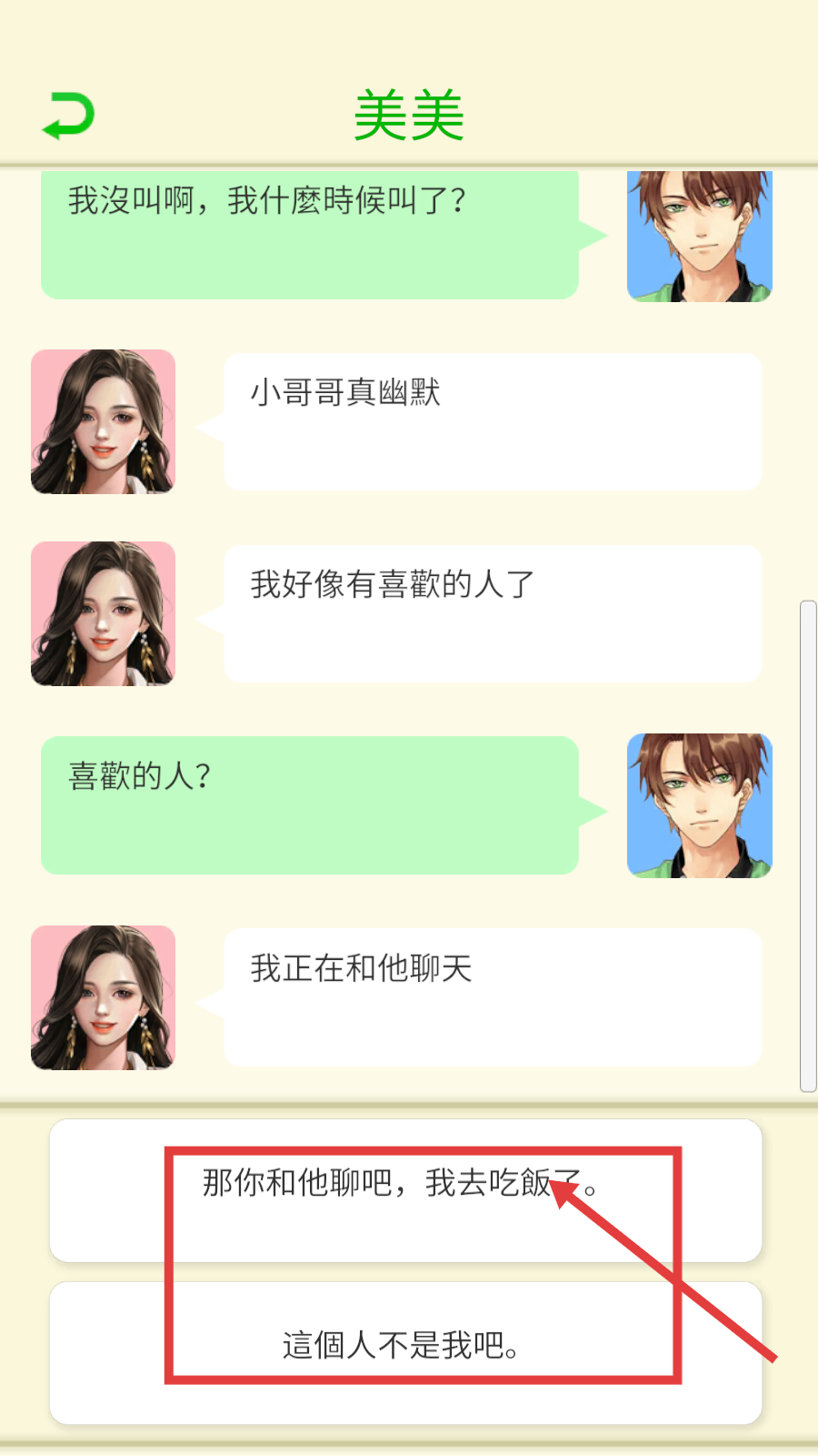 1、与美美聊天时,当她提及有喜欢的人,选择【那你和他聊吧,我去吃飯了。】,以合适的互动推进聊天进程。