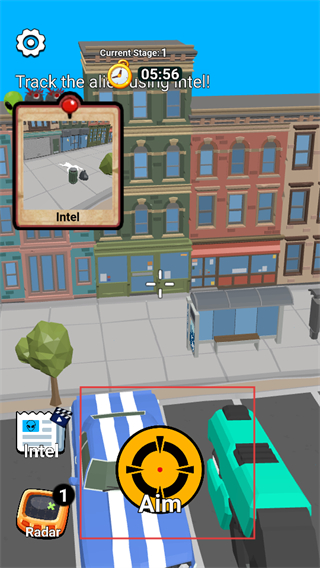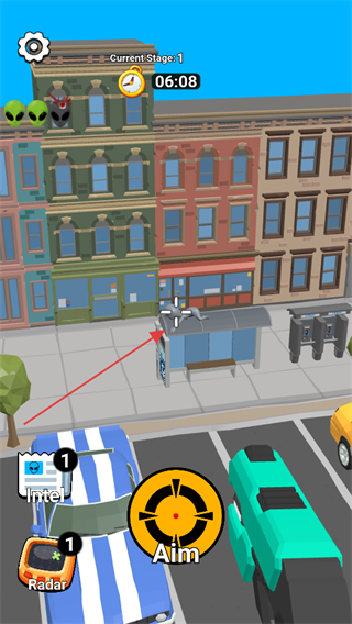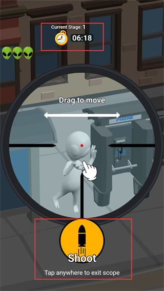 2、通过“Aim”瞄准功能锁定外星人,进入瞄准镜视角后,拖动调整瞄准位置,点击“Shoot”按钮射击,消灭外星人。