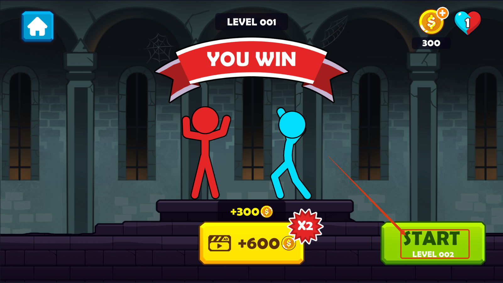1、Level001通关后获得300金币,点击“STARTLEVEL002”进入下一关,可观看视频翻倍金币(+600),积累资源助力后续挑战。