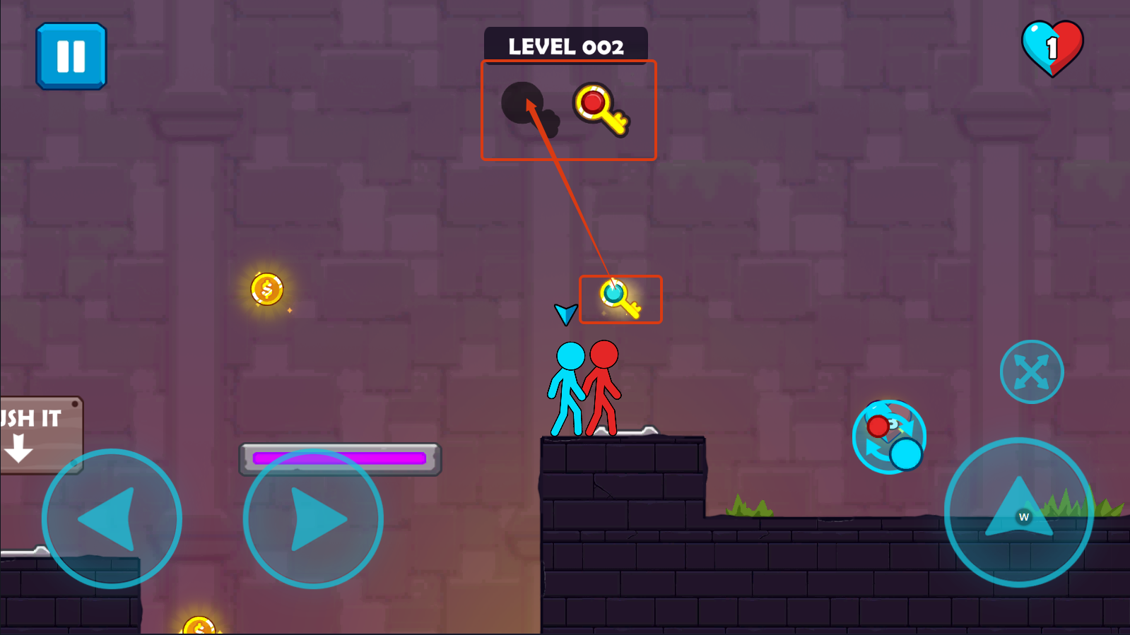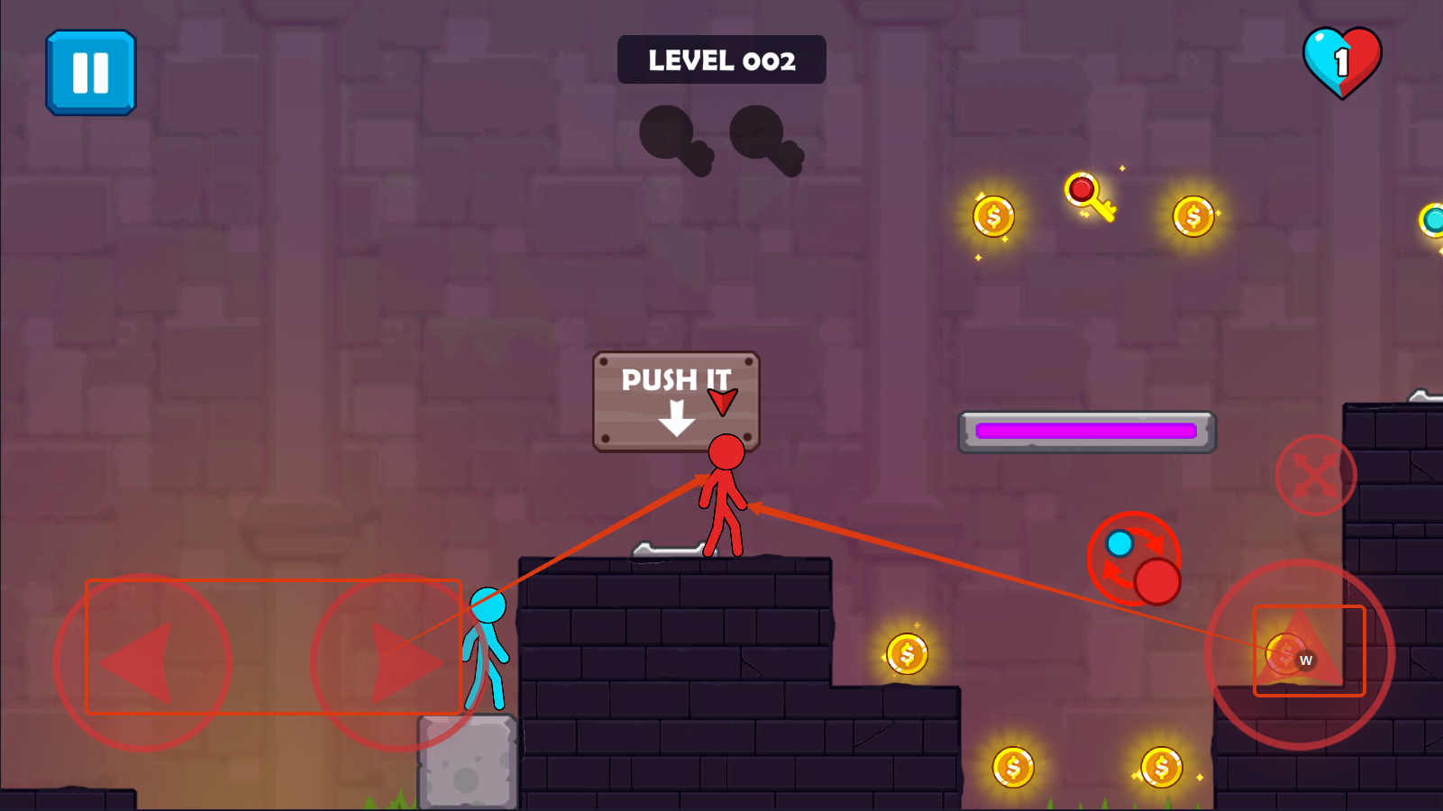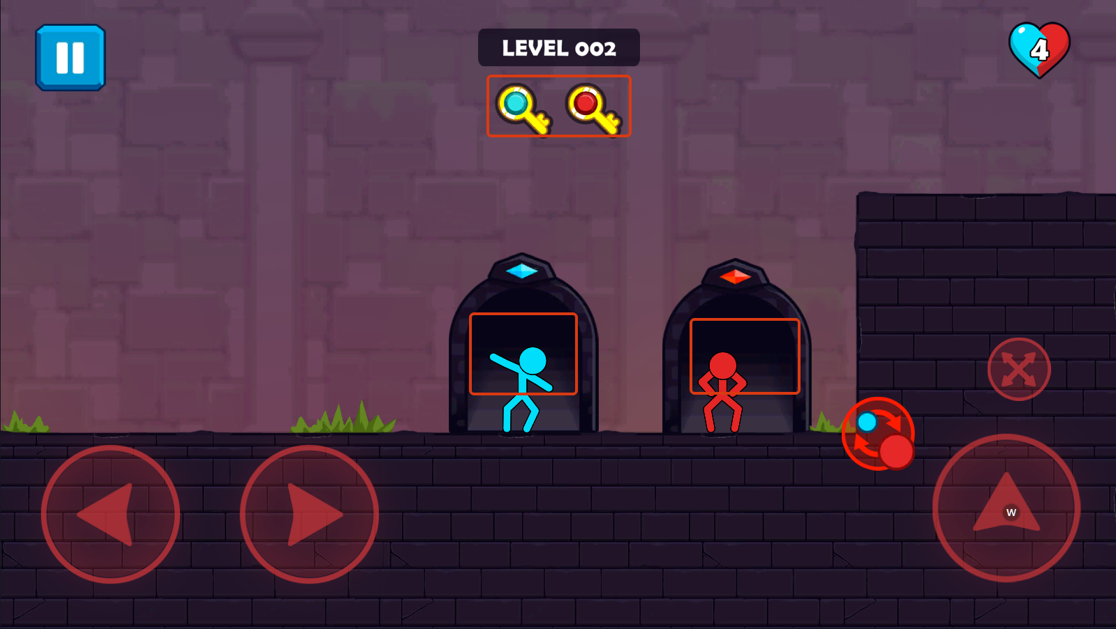 2、Level002中,通过左侧左右箭头控制移动,右侧“W”键跳跃,中间切换角色按钮可在红蓝火柴人间切换,协同完成关卡任务。