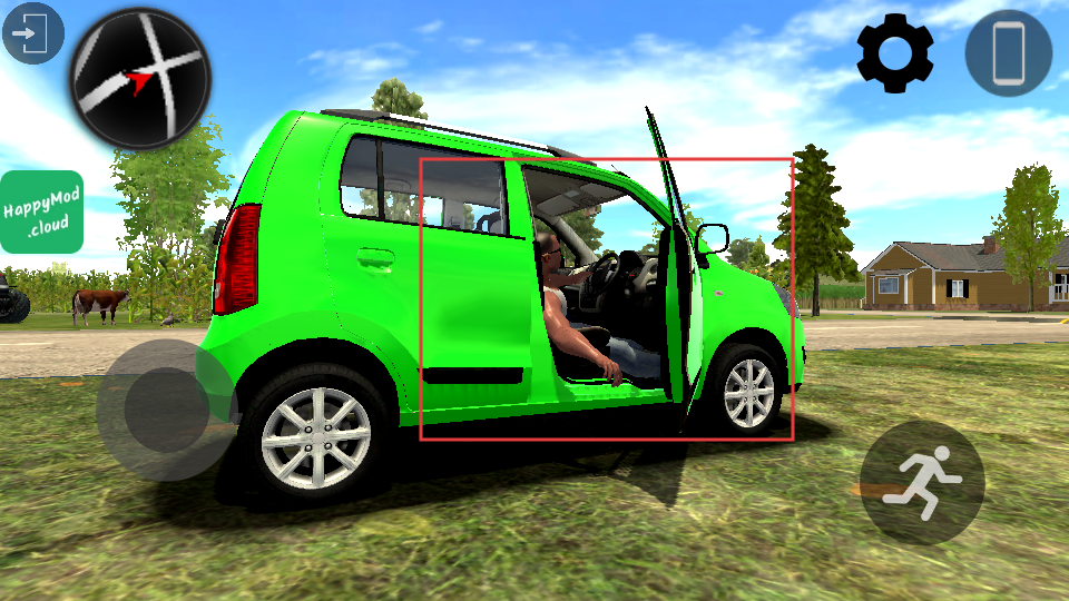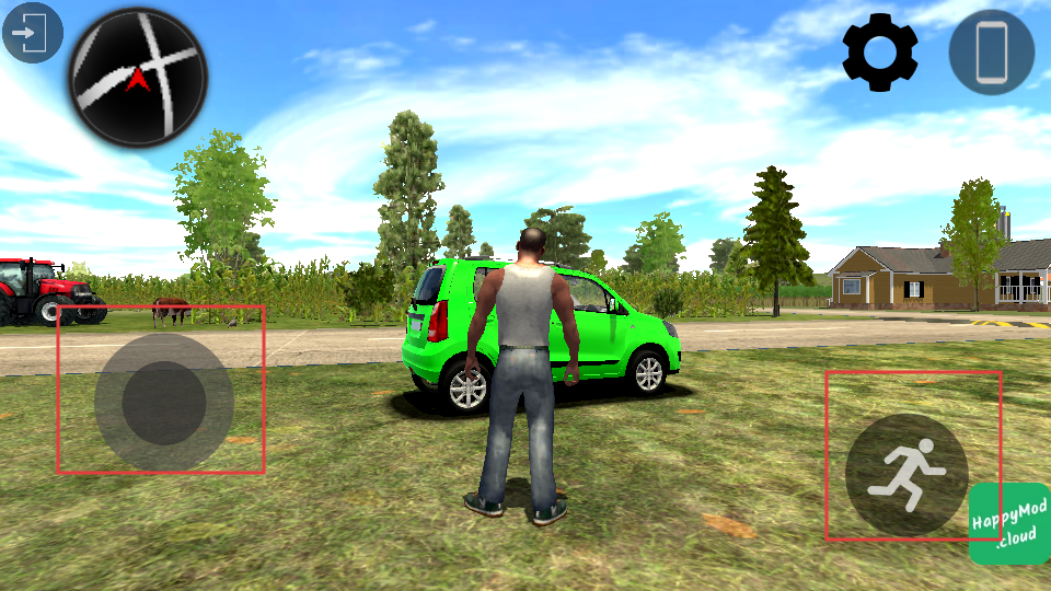 2、在游戏场景中,通过左侧虚拟摇杆控制角色移动,右侧奔跑按钮控制角色奔跑,靠近车辆可进入驾驶状态。