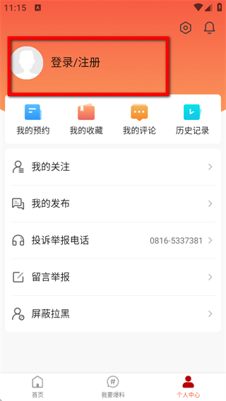 2、在个人中心界面,点击登录/注册选项,进入登录注册页面。