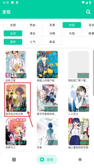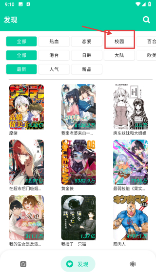 2、在发现页面,点击校园分类,进入校园类漫画列表页面。