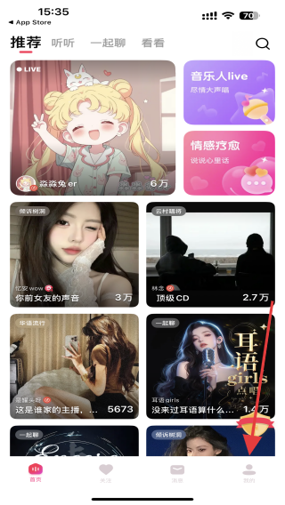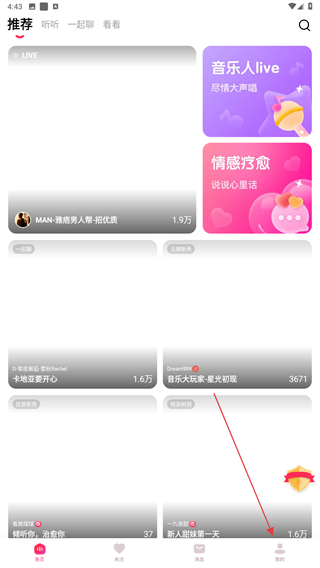 1、打开LOOK直播的APP,进入首页点击右下我的。