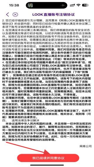 4、进入注销流程后,先阅读注销协议,再下拉点击底部我已阅读并同意协议,即可提交注销申请。