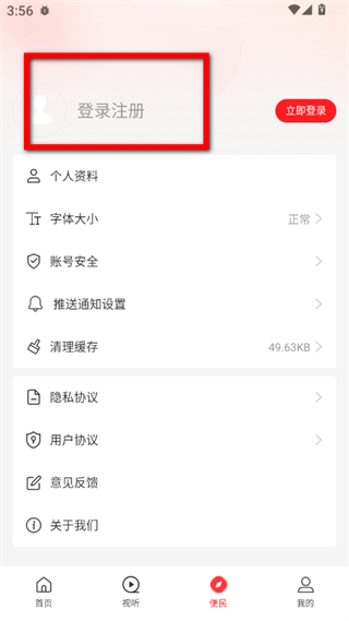 2、在个人界面,点击登录注册区域,进入登录页面。