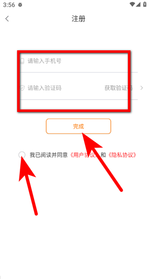 4、在注册界面,填写手机号验证码,勾选协议后点击完成,完成注册操作。