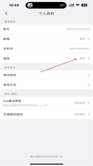 3、在个人资料的界面内,在微信右侧点击绑定的按钮。
