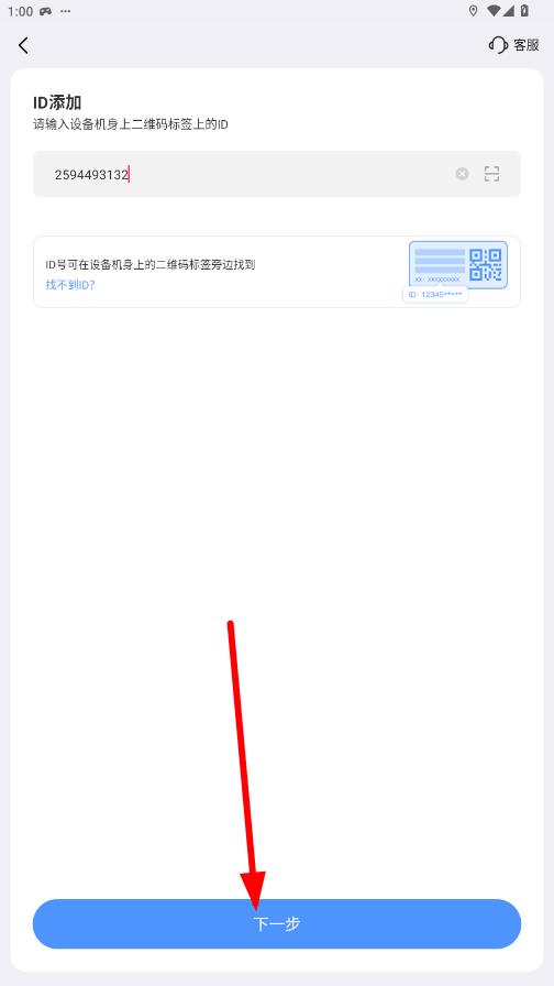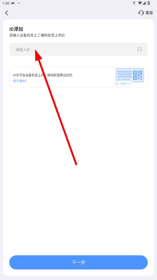 3、进入ID添加界面后,在输入框中输入设备机身上二维码标签旁的ID号。