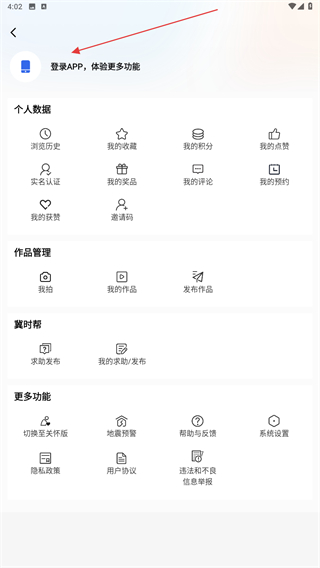 2、进入个人主页内,点击登录APP,体验更多功能的区域。