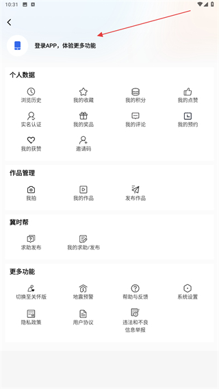 2、进入个人主页内,点击上方登录APP,体验更多功能的区域。