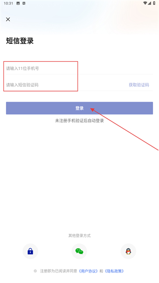 3、在短信登录的界面内,输入手机号、验证码,再点击登录即可。