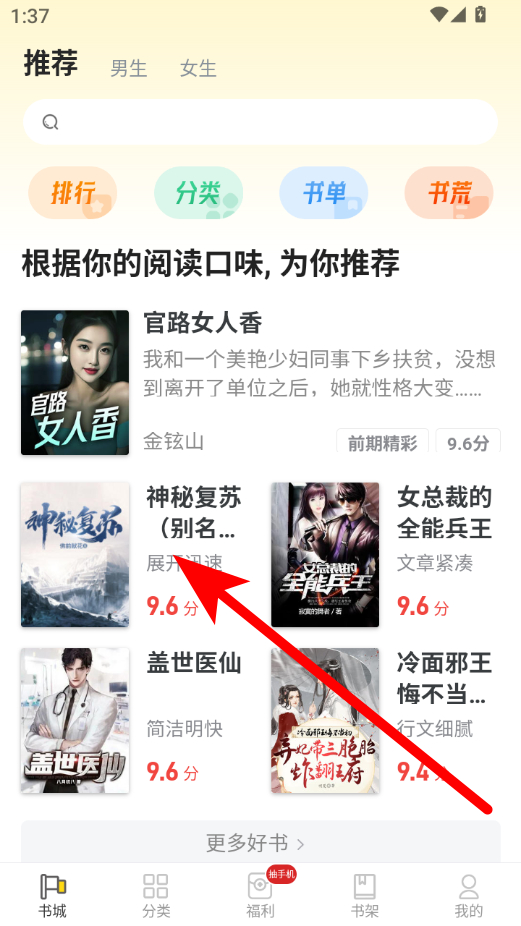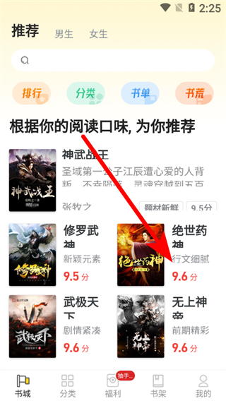 1、在饭团追书书城页面,点击想要调整字体的小说,进入小说详情页面。