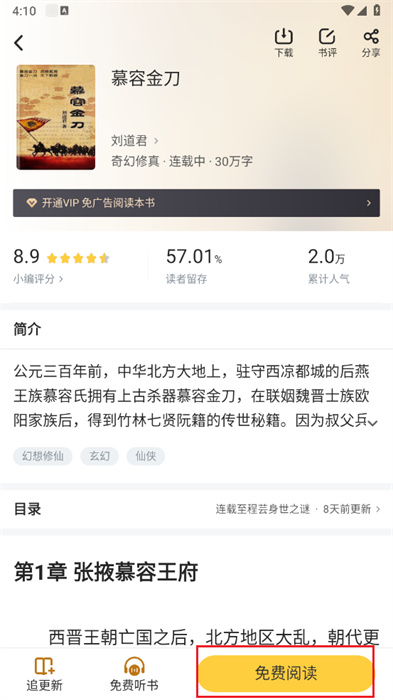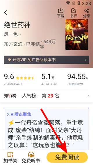 2、在小说详情页面,点击免费阅读按钮,进入小说阅读页面。