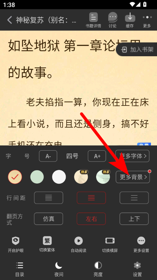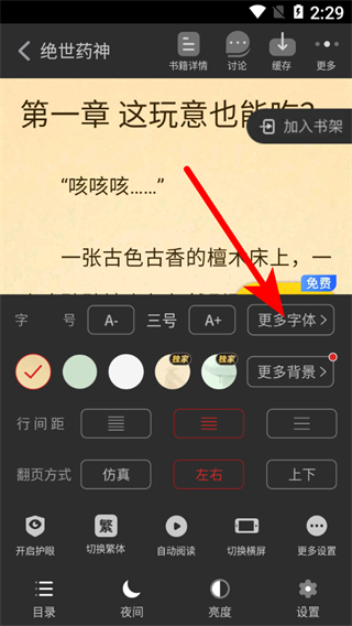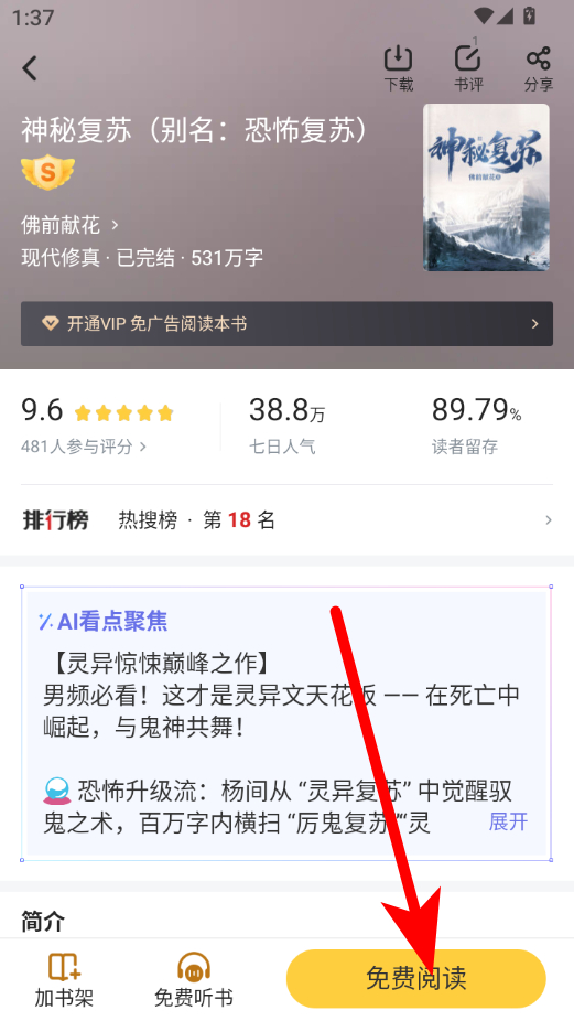 2、在小说书籍详情页点击免费阅读,进入阅读界面。