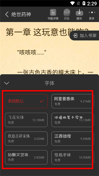 5、选择想要设置的字体,即可完成饭团追书字体调整任务。