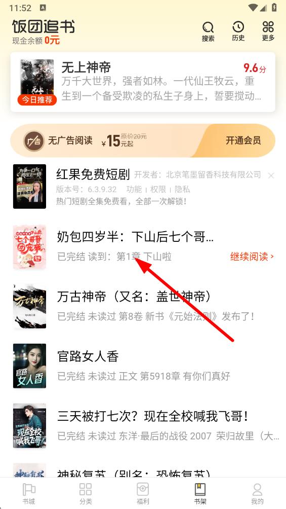 1、打开饭团追书APP,在书架页面选择一本要阅读的小说,点击进入阅读界面。