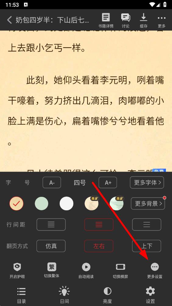 3、在阅读设置页面中,点击更多设置选项,进入更多设置界面。