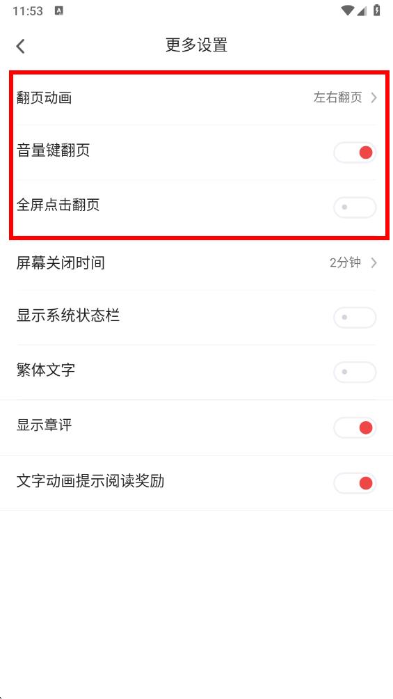 4、在更多设置界面里,找到翻页动画选项可选择喜欢的翻页效果,还能通过音量键翻页和全屏点击翻页的开关按钮,开启或关闭对应翻页方式。