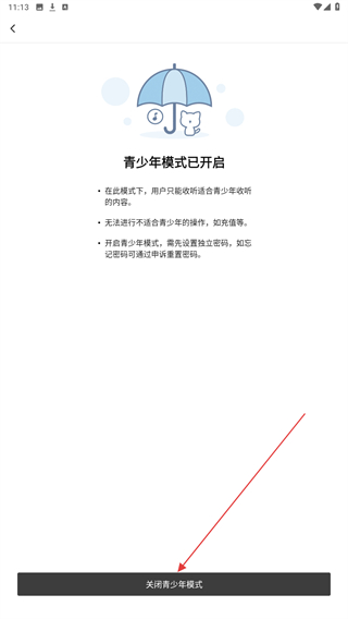 3、进入青少年模式的页面内,目前处于开启的状态,点击下方关闭。