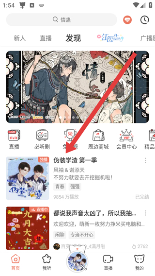 1、打开猫耳FM,在首页选择要播放的音频如伪装学渣第一季,进入广播剧播放的界面。