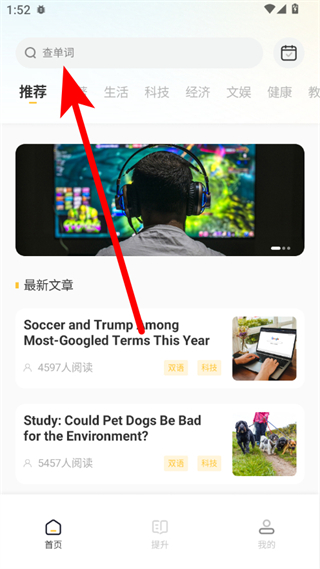 1、在应用首页,点击查单词搜索框,进入翻译界面。
