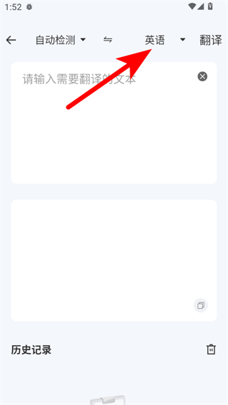 2、在翻译界面,点击英语或当前显示的语言选项,弹出语言列表。