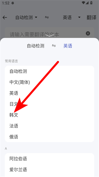3、在语言列表中,选择目标翻译语言,如韩文。