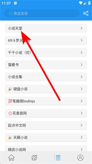 1、在小说APP页面,点击小说天堂选项,进入分类界面。