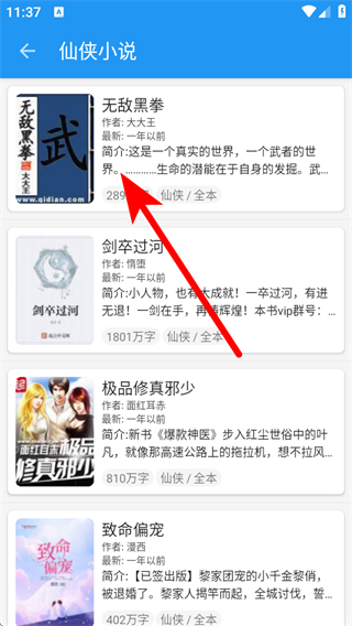 3、在仙侠小说列表页面,点击无敌黑拳条目,进入书籍信息界面。