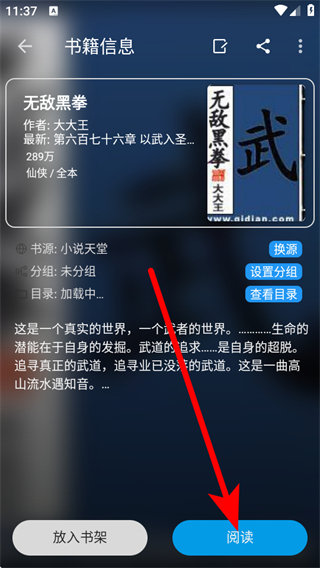 4、在书籍信息界面,点击阅读按钮,即可开始阅读该小说。