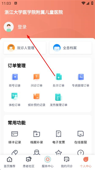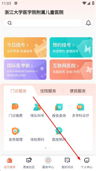 1、打开浙大儿院APP,点击底部导航栏的个人中心选项。