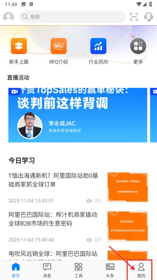 1、打开外贸学习APP,点击底部我的选项,进入个人中心页面。