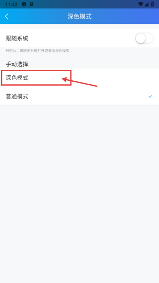 4、在深色模式页面,选择深色模式选项,完成界面风格切换。