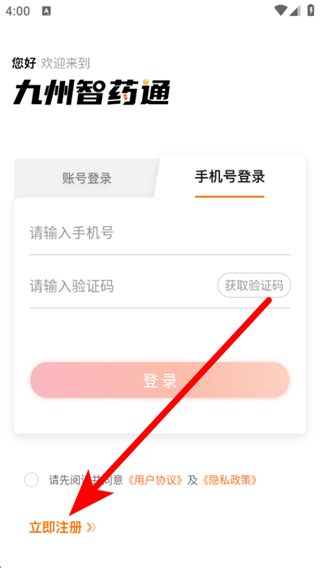 1、打开九州智药通APP登录页面,点击立即注册的按钮。