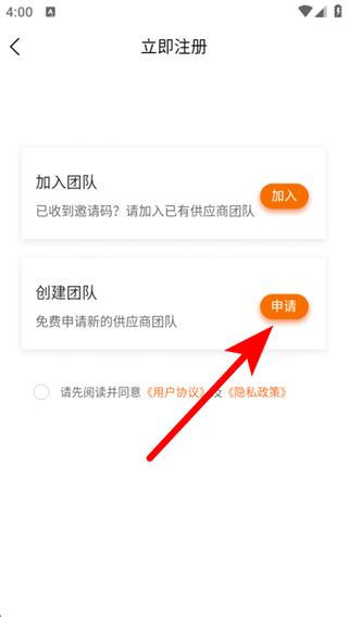 2、进入注册页面后,这里选择创建团队并点击申请。
