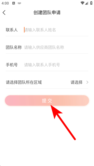 3、在创建团队申请页面,依次填写信息后点击提交,完成注册操作。
