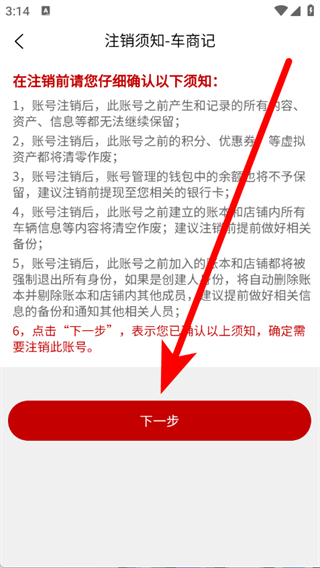 4、在注销须知页面,仔细阅读须知后,点击下一步。